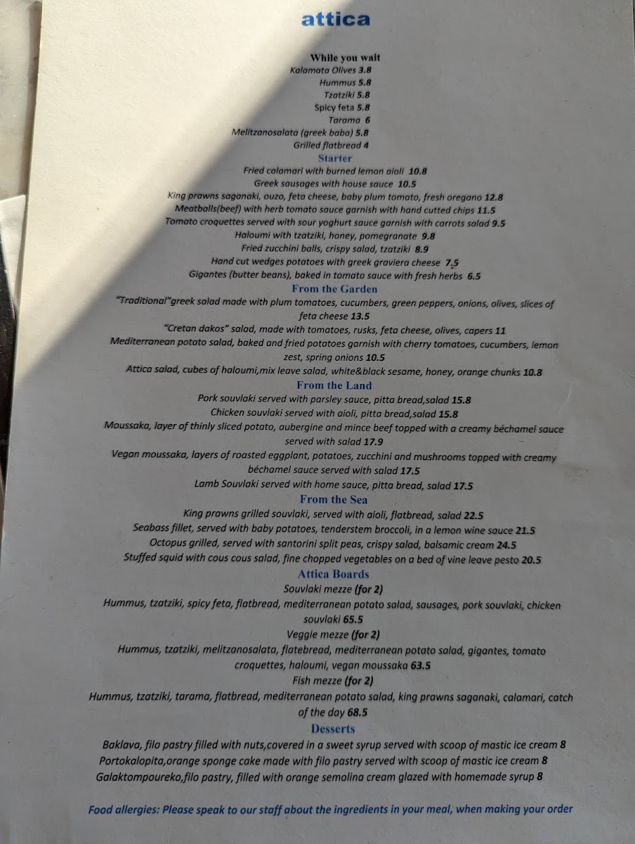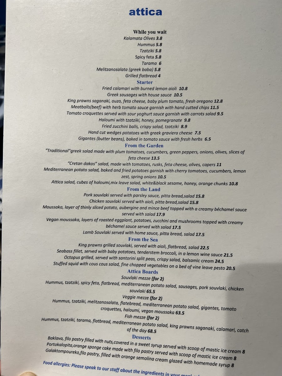 From a reviewer’s perspective, the menu at Attica London offers a well-rounded and authentic journey through Greek cuisine, thoughtfully structured to suit both sharing and individual dining. The starters set the tone with crowd-pleasing dishes such as Fried Calamari with Burned Lemon Aioli, Greek Sausages with House Sauce, and the rich King Prawns Saganaki with Ouzo, Feta Cheese, Baby Plum Tomato, and Fresh Oregano, all designed to awaken the palate. Lighter options from the garden, including the Traditional Greek Salad, Cretan Dakos Salad, Mediterranean Potato Salad, and the signature Attica Salad with Cubes of Halloumi, Mixed Leaves, White & Black Sesame, Honey, and Orange Chunks, provide freshness and balance.