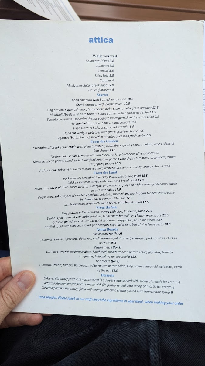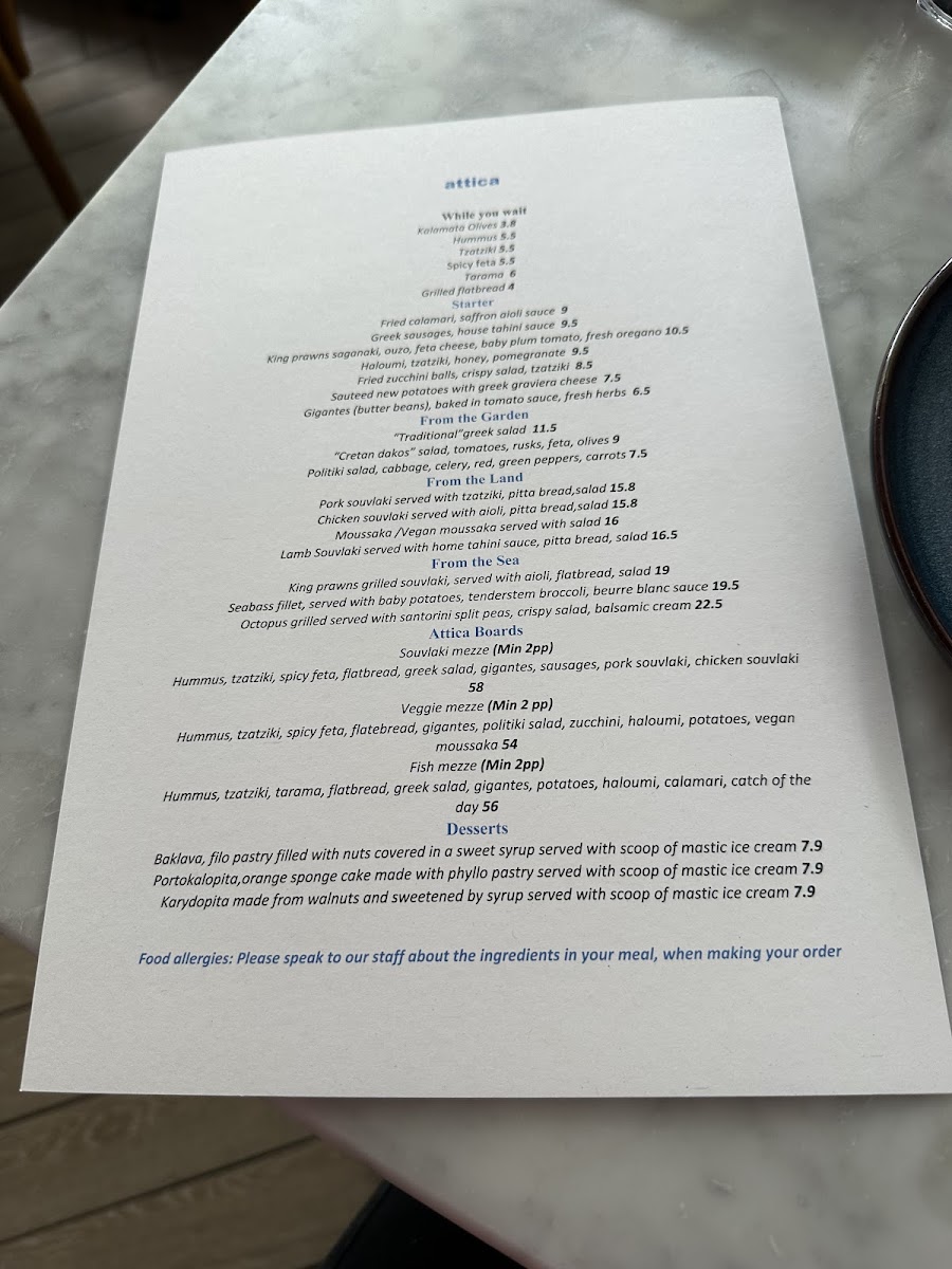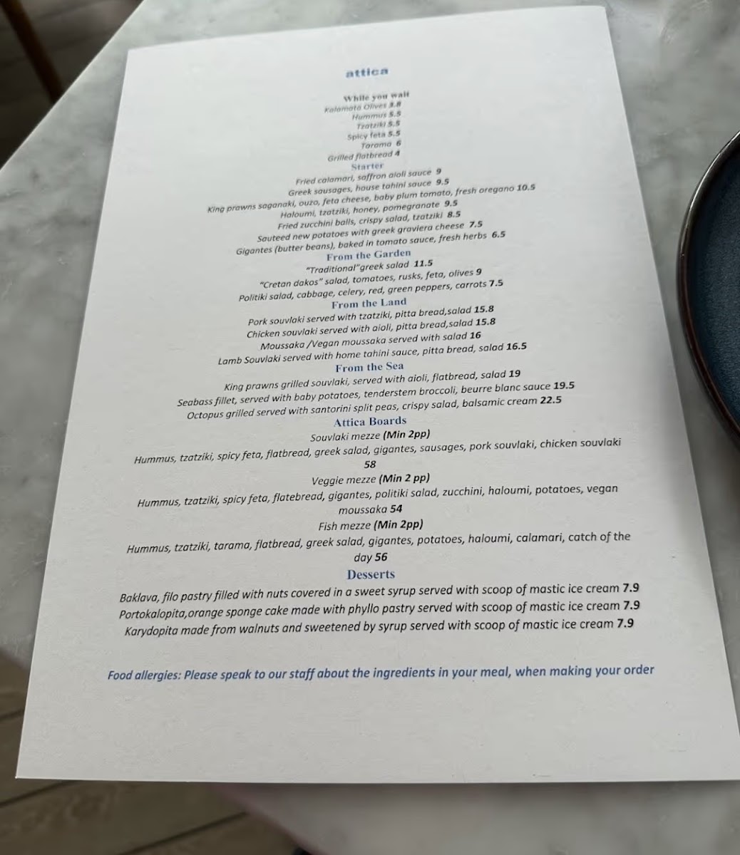 For sharing, the Souvlaki Mezze, Veggie Mezze, and Fish Mezze boards bring variety to the table, while smaller bites such as Kalamata Olives, Hummus, Tzatziki, Spicy Feta, and Tarama are perfect “while you wait” additions. Desserts provide a sweet and traditional finale with Baklava, Portokalopita, and Galaktompoureko, each served with a scoop of fragrant mastic ice cream. Overall, Attica London’s menu feels cohesive, generous, and deeply rooted in Greek tradition, making it a satisfying conclusion to any meal at this Exmouth Market spot.